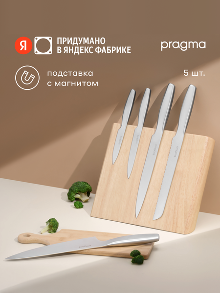 Pragma — это бренд эстетичных и функциональных решений для дома, придуманный в Яндексе. ㅤ Pragma Listad — это набор ножей из нержавеющей стали для повседневной готовки. В комплект входят шеф-нож, хлебный нож, 2 универсальных ножа разного размера и нож для чистки овощей. ㅤ У ножей цельнометаллическая литая конструкция, поэтому они прочные и простые в уходе. Лезвия устойчивы к царапинам и ржавчине, до 6 месяцев остаются острыми без заточки. Полая рукоятка делает ножи легче, поэтому они комфортно лежат в руке. ㅤ В набор входит подставка из каучукового дерева — экологичного и устойчивого к влаге материала. Ножи можно хранить как в отверстиях подставки, так и на магнитной поверхности спереди. ㅤ Набор ножей можно мыть в посудомоечной машине на эко-режиме при температуре не выше 60 °C и с моющими средствами с нейтральным pH. Дверцу машины стоит приоткрыть по окончании цикла для естественной сушки. При ручной мойке следует использовать только мягкую сторону губки, а затем протирать ножи сухой салфеткой — так ножи прослужат дольше.
