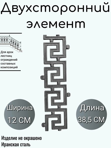 Иранский кованый элемент — это великолепное произведение искусства, сочетающее в себе изящество и уникальность. Внимание к мельчайшим деталям делают каждый элемент уникальным и неповторимым. Кованые элементы иранского производства известны безупречным качеством и прекрасным исполнением. Кованые элементы часто используются для украшения интерьера, придавая ему особый шарм и элегантность. Они могут стать изюминкой в декоре или служить как акцентная деталь. Благодаря их уникальному дизайну и изысканности, они способны привнести дух восточного роскошества в любое помещение. Изделие не окрашено, из-за чего рекомендуется хранить их в сухом помещении. Редко могут иметь незначительные следы локальной коррозии. Это не является браком или дефектом, так как не влияет на их потребительские свойства, а дальнейшее их использование в конструкциях лестниц и ограждений, предполагает их подготовку, монтаж, грунтовку и покраску. Технические характеристики элемента могут незначительно отличаться от заявленного.