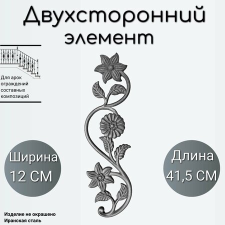 Иранский кованый элемент — это великолепное произведение искусства, сочетающее в себе изящество и уникальность. Внимание к мельчайшим деталям делают каждый элемент уникальным и неповторимым. Кованые элементы иранского производства известны безупречным качеством и прекрасным исполнением. Кованые элементы часто используются для украшения интерьера, придавая ему особый шарм и элегантность. Они могут стать изюминкой в декоре или служить как акцентная деталь. Благодаря их уникальному дизайну и изысканности, они способны привнести дух восточного роскошества в любое помещение. Изделие не окрашено, из-за чего рекомендуется хранить их в сухом помещении. Редко могут иметь незначительные следы локальной коррозии. Это не является браком или дефектом, так как не влияет на их потребительские свойства, а дальнейшее их использование в конструкциях лестниц и ограждений, предполагает их подготовку, монтаж, грунтовку и покраску. Технические характеристики элемента могут незначительно отличаться от заявленного.