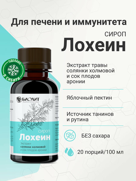 Лохеин сироп для печени и желчного пузыря от Биолит. Основное действие: Гепатопротекторное действие – защита и восстановление клеток печени Антиоксидантный эффект – нейтрализует токсины и свободные радикалы Желчегонное действие – профилактика застоя желчи Иммуномодулирующее – укрепляет защитные силы организма Детокс-эффект – очищение печени при отравлениях и интоксикациях Преимущества: Натуральный состав на основе солянки холмовой – мощного гепатопротектора Оптимизирует работу печени и поджелудочной железы Нормализует жировой обмен, помогает при повышенной нагрузке на печень Замедляет процессы старения за счет антиоксидантов Подходит для профилактики и комплексной терапии Действующие вещества: Экстракт солянки холмовой и сок плодов аронии обладают гепатозащитным, антиоксидантным и иммуномодулирующим действием. Особенности препарата: 1 упаковка на 7 дней. Вкусно и полезно. 100% натурально Натуральный и безопасный состав Комплексное действие на печень и желчевыводящие пути Удобная форма приема Подходит взрослым и детям старше 14 лет. Без ГМО и искусственных добавок. Совместим с лекарственными средствами. Способ употребления: взрослым принимать по 1 чайной ложке (5 мл), предварительно растворив в ½-1 стакане воды, 3 раза в день во время еды. Возможно выпадение осадка, перед употреблением взбалтывать. Перед применением рекомендуется проконсультироваться с врачом. Продолжительность приема: 3-4 недели. Состав: Концентрат плодово-ягодный (яблочный), вода, концентрированный сок плодов аронии черноплодной (Aronia melanocarpa L.), экстракт концентрированный травы солянки холмовой (Salsola collina Pall.) лимонная кислота, сорбат калия, бензоат натрия. Противопоказания: Индивидуальная непереносимость компонентов, беременность и кормление грудью. Форма выпуска: Флакон темного цвета 100 мл Почему выбирают "Лохеин" от Биолит? Натуральный и безопасный состав Комплексное действие на печень и желчевыводящие пути Доказанная эффективность Удобная форма приема