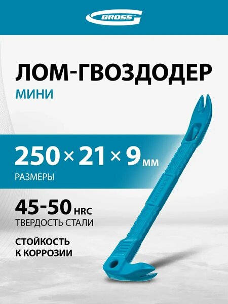 Лом-гвоздодер Gross мини 25251 размером 250 х 21 х 9 мм позволяет легко извлекать даже гвозди с глубоко утопленными шляпками — справляться с ними помогает специальный выступ на рабочей части инструмента. Лом-гвоздодер будет полезен на строительной площадке, во время ремонта, а также при решении бытовых задач. Преимущества•Надежность — инструмент из кованой инструментальной стали С45 отличается высокой прочностью.•Высокий ресурс — рабочие части прошли термообработку до твердости 45-50 HRC, поэтому инструмент устойчив к износу.•Стойкость к коррозии — корпус покрыт защитным лакокрасочным составом.•Компактность — лом-гвоздодер с плоским профилем весит всего 406 г и имеет размер 250 х 21 х 9 мм, поэтому удобен в транспортировке и не занимает много места в зоне хранения.