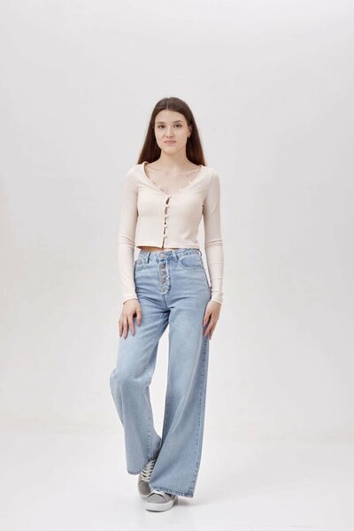 Укороченный лонгслив прилегающего кроя с деликатным V-образным вырезом. Выполнен из приятного к телу фактурного материала. Застегивается на ряд воздушных петель с пуговицами в тон.