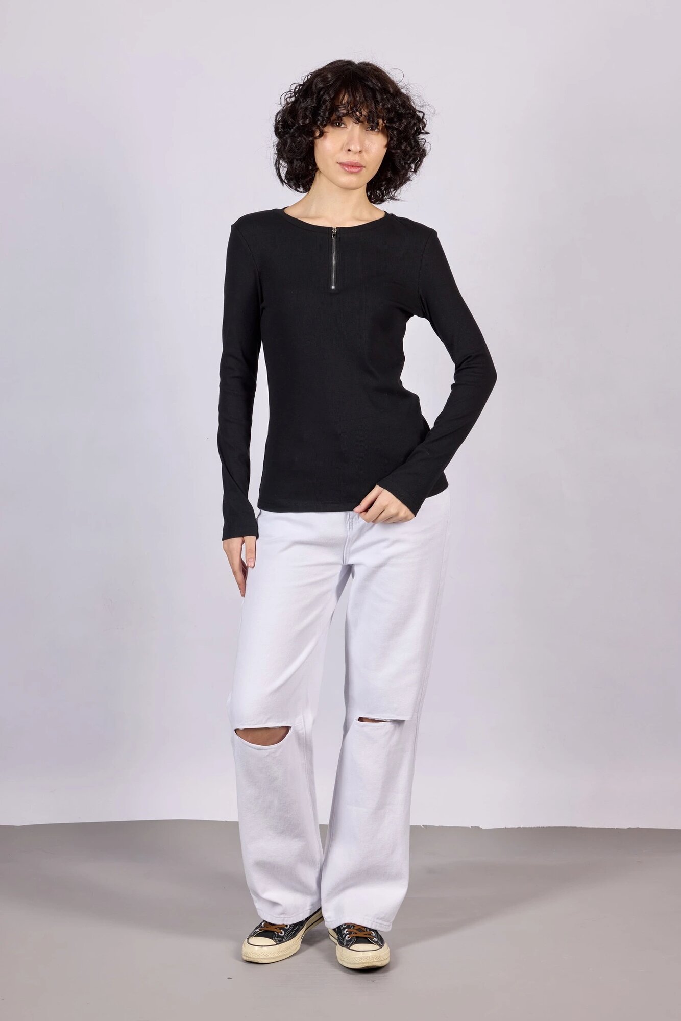Лаконичный лонгслив полуприлегающего кроя с молнией, выполненный из приятного к телу трикотажного материала. Отличная базовая модель, необходимая в любом гардеробе.