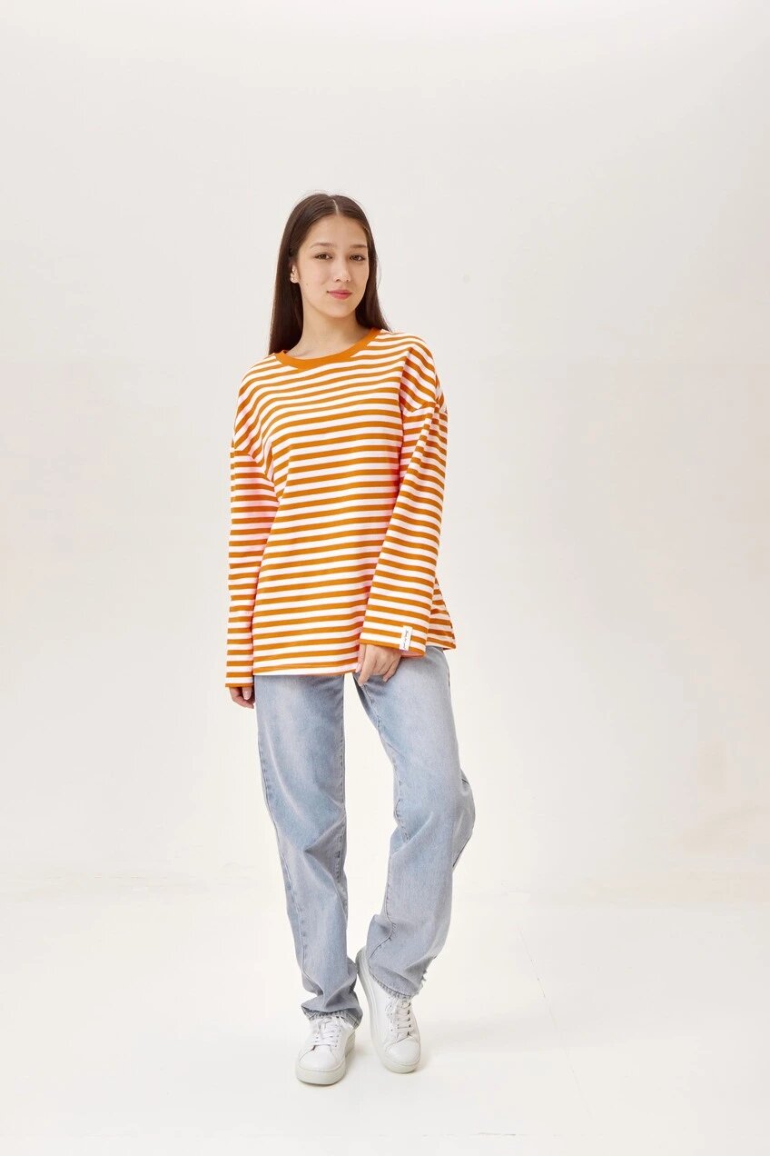 Приятный лонгслив в нежную полоску. Имеет круглый вырез и спущенную линию плеча с широкими рукавами. Модель станет деликатным элементом образа для прогулки или отдыха.