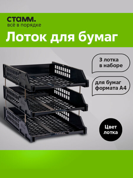 Лоток для бумаг горизонтальный канцелярский / подставка, органайзер для документов А4 СТАММ "Strong" металлический, 3 секции, черный / офисная канцелярия. Описание продукта: Лоток для бумаг горизонтальный канцелярский СТАММ "Strong" - это функциональный органайзер для хранения документов формата А4. В комплекте поставляется набор из трех горизонтальных лотков, каждый из которых имеет одну секцию. Такая конструкция позволяет вмещать большое количество бумаг и документов, обеспечивая их надежную фиксацию друг на друге с помощью металлических стержней. Горизонтальный лоток выполнен из прочного и устойчивого качественного полистирола, что гарантирует его долговечность и надежность. Корпус лотка для бумаг имеет стильный черный цвет, который добавляет элегантности и современности в офисную обстановку. Накопитель для бумаг горизонтальный обладает конструкцией, которая предусматривает возможность установки верхнего лотка на 90 градусов. Данная особесонность позволяет удобно расположить лоток для бумаги и организовать доступ к документам, там самым максимально использовать пространство на рабочем столе. Лоток канцелярский поставляется в разобранном виде, но сборка является простой и быстрой благодаря инструкции, которая входит в комплект. Для надежной упаковки и защиты от повреждений органайзер для документов упакован в термоусадочную пленку. Высота лотка для бумаги составляет 267 мм, глубина - 335 мм, ширина - 255 мм, что делает его компактным и удобным для размещения на столе или в офисном шкафу. Лоток горизонтальный канцелярский для бумаг СТАММ "Strong" - это идеальное решение для организации рабочего пространства, где можно хранить и легко найти все необходимые документы. Приобретайте этот качественный и эффективный органайзер, чтобы сделать свою работу более удобной и продуктивной. Лотки и накопители для бумаг СТАММ – неотъемлемая часть организации рабочего пространства в офисе. Эта категория товаров включает в себя различные виды лотков и накопителей, предназначенных для удобного хранения и сортировки бумаг и документов. В нашем ассортименте вы найдете разнообразные лотки для бумаг, которые помогут вам упорядочить рабочий стол и сделать его более функциональным и просторным. У нас есть вертикальные лотки, которые занимают меньше места и позволяют удобно разделить документы по категориям, а также горизонтальные лотки, которые подходят для хранения большого количества бумаг, а также веерные лотки – это отличное решение для тех, кто хочет иметь быстрый доступ к нужным документам. Наши органайзеры для канцелярии позволяют удобно хранить и сортировать канцелярские принадлежности, такие как ручки, карандаши, скрепки и многое другое. Накопители для бумаг помогут вам удобно разместить документы и сохранить их целостность, лоток для бумаги может быть сборными, раздвижным с одной, двумя, тремя секциями и легко устанавливаться на рабочий стол или полку. Выбирайте лотки и накопители для бумаги из нашего широкого ассортимента и организуйте свое рабочее пространство максимально удобно и эффективно. Они помогут вам сохранить порядок и сделать работу с документами более удобной и продуктивной.