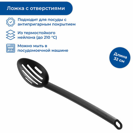 Ложка шумовка SPACE LINE подходит для всех видов посуды, отлично подходит для посуды с антипригарным покрытием, так как не повредит антипригарную поверхность. Материал: Изготовлена из первоклассного термостойкого нейлона, устойчивого до 210 ° C. Не оставляйте в пище более 10 минут, обесцвечивание продуктов не является их дефектом. Уход: можно мыть в посудомоечной машине. Гарантия: 3 года.