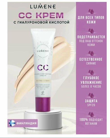 Невесомое, но при этом стойкое тонирующее средство CC-крем Lumene Абсолютное совершенство для безупречного покрытия. br br Подстраивается под естественный оттенок кожи. br Может использоваться самостоятельно или как база под макияж. br Ложится на лицо равномерным слоем, скрывая недостатки кожи, покраснения, черные точки. br Преображает кожу, возвращая ей упругость и здоровый цвет. br SPF 20 защищает кожу от вредного воздействия ультрафиолетовых лучейbr br Формула CC Color Correcting Cream включает брусничный экстракт и кристально чистую воду из Арктики. Клинические исследования показали, что увлажняющий эффект продукта длится более 8 часов. br br Обращаем внимание на возможные изменения в дизайне упаковки. Поставка осуществляется в зависимости от наличия на складе.