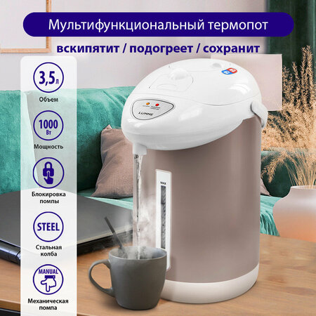 Термопот электрический, кипячение - 1000 Вт, подогрев - 30 Вт, емкость 3.5Л, высококачественная сталь, кипячение/автоподогрев, автоотключение при недостатке воды, LED-индикация режимов работы, защита от перегрева, ручной насос Компактный термопот емкостью 3,5 литра с удобной индикацией панели управления и функцией поддержания температуры. Два режима работы – автокипячение и поддержание температуры позволяют использовать термопот с наименьшими энергозатратами, при этом горячая вода или кипяток - всегда под рукой. Благодаря корпусу из нержавеющей стали и закрытому нагревательному элементу термопот обладает значительной прочностью и экологически чист - нержавеющая сталь не имеет запаха и сохраняет природные натуральные свойства воды. Плоское дно термопота с закрытым нагревательным элементом очень функционально – легко моется, противостоит накипи, не ржавеет, не корродирует, а значит, обеспечивает термопоту максимально долгий срок службы. Блокировка помпы ручного насоса управления и многоуровневая защита обеспечивает полную безопасность использования прибора. Термопот для дачи, чайник металлический для кухни, чайник-термос. Ручная помпа позволяет наливать воду без подключения к электросети! Удобно брать на улицу! Термопот в офис, чайник электрический для офиса. Электрический термопот для аппартаментов, чайник для отелей, термопот для гостиниц.