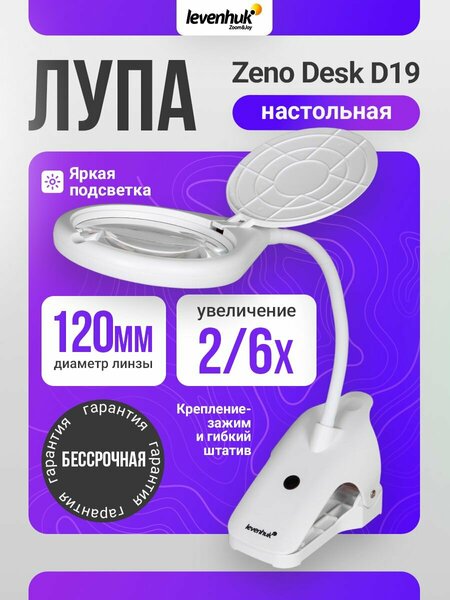 Увеличение: 2/6х. Диаметр: 120/25 мм. Светодиодная подсветка Настольная лупа Levenhuk Zeno Desk D19 – оптический прибор с бифокальной линзой, светодиодной подсветкой и креплением-прищепкой. Такую лупу можно и поставить на стол, и закрепить на дверце шкафа или полке. Вариативность размещения и гибкий штатив делают лупу универсальным инструментом для часовых мастеров, ювелиров, моделистов, рукодельниц и всех, кто часто работает с мелкими деталями. Лупа оставляет обе руки свободными и позволяет решать множество профессиональных задач. Линза лупы Levenhuk Zeno Desk D19 позволяет изучать область размером до 120 мм на двукратном увеличении. На небольшой области диаметром 25 мм доступно более мощное увеличение – в 6 крат. Восемь ярких светодиодов возле линзы позволяют рассматривать объекты под увеличением даже в темноте. Подсветка имеет регулировку яркости и работает от электросети. Закончив работу с лупой, можно закрыть линзу откидной защитной крышкой – она не позволит пыли скопиться на поверхности. Особенности: