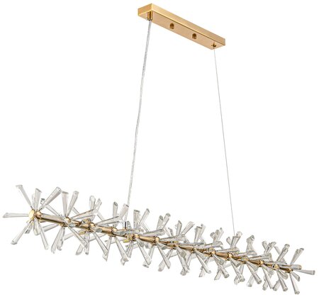 Люстра Star Light L1000 в виде светящейся полосы создана искусными дизайнерами, сумевшими соединить в одном изделии роскошь и лаконичность. На золотистом металлическом стержне, играющем роль каркаса, крепятся изящные элементы из прозрачного стекла, играющие одновременно декоративную и функциональную роли. Свет, проходящий сквозь стеклянную преграду, частично рассеивается и смягчается, становится более приятным для человеческого глаза. Светильник длиной 1 м содержит в своем составе 15 цоколей G4 со светодиодными лампочками, крепится двумя тонкими нитями к потолочной планке. Модель подходит для оформления квартир, гостиниц и развлекательных заведений.