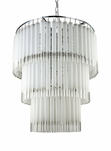 Трехъярусная люстра Tyrell на основе металлического каркаса цвета «хром», состоящего из системы колец разного диаметра, расположенных на разных уровнях. На кольцах удерживаются длинные узкие пластины из матового стекла, которые закрывают лампочки и создают преграду для света, частично рассеивают и приглушают его, делают более комфортным для человека. Модель представлена в двух модификациях, с диаметром верхнего яруса 600 и 800 мм и количеством лампочек 16 и 20 соответственно. Подвешивается к потолку за цепочку, идеально вписывается в интерьеры помещений, выдержанных в стиле модерн, ретро или неоклассика.