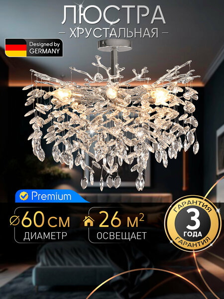 Современная роскошная хрустальная люстра украсит любое помещение. Гостиная, зал, спальня, кухня, прихожая станут центром внимания в вашем доме. Люстра имеет круглую форму с диаметром 60 см и способна осветить до 26 кв. м. Подвески с хрустальным стеклом блестят и придают изысканности, добавив роскоши интерьеру Для данной модели необходимо приобрести 8 лампочек с цоколем E14, мощностью до 15W для светодиодных и до 40W для ламп накаливания. Установите лампочки желаемой температуры свечения - тёплого, естественного или холодного света для создания комфортной обстановки. Для уютной обстановки используйте лампочки с цветовой температурой 3000K. Патроны для лампочек обладают функцией наклона и поворота, что позволяет регулировать направленность и улучшает рассеивание света. Данная люстра легко устанавливается на любой тип потолка, включая натяжной, и имеет скрытый тип монтажа, что делает его универсальным решением для любого интерьера. Люстра станет отличным решением как для низкого потолка, так и для высокого. В комплекте идёт подробная инструкция по сборке и установке. Люстра выполнена из качественного металла и алюминия, что обеспечивает ей прочность и долговечность. Производитель предоставляет расширенную гарантию 3 года. Степень пылевлагозащиты IP20 гарантирует, что светильник будет хорошо работать в обычных условиях использования. Выбирая эту люстру, вы получаете не только качественное и эффективное освещение, но и возможность создать уникальную атмосферу в вашем доме.
