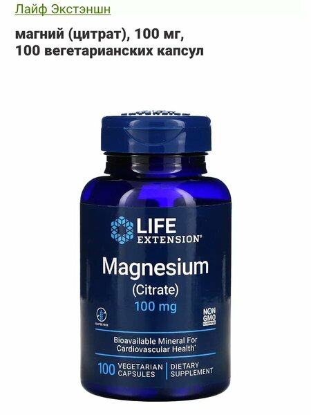 Life Extension Магний (цитрат) 100 мг – добавка магния для мужчин и женщин – для здоровья сердца и костей, поддержки иммунной системы – без глютена, без ГМО – 100 вегетарианских капсул высокая эффективность для сна, судорог ног, повышенная абсорбция, легко глотаемые капсулы. Магний в форме цитрата в растительных капсулах откомпании Life Extension. Магний — важный минерал для здоровья, так как он участвует в более чем 300 биохимических реакциях. Наша добавка с магнием (цитрат) содержит 160 мг этого элемента в каждой вегетарианской капсуле. СОН, судороги ног, кости, нервы. Главным преимуществом нашего цитрата магния является то, что он выпускается в небольших капсулах, легко проглатываемых. Наша эксклюзивная формула, подходящая для женщин и мужчин, помогает облегчить судороги в ногах, успокоить сон, улучшить здоровье сердца, придать энергию и избавиться от болей в суставах. Наша ежедневная добавка Mag, также известная как Mag Citrate, помогает обеспечить мягкую поддержку опорожнения кишечника и является веганской, в отличие от многих магниевых капсул, комплексных порошков и витаминных таблеток* Магний помогает укрепить здоровье сердечно-сосудистой системы, иммунной системы, костей, а также обладает другими преимуществами. Преимущества магния (цитрата) Способствует нормальной работе мышц и нервов Поддерживает здоровье сердечно-сосудистой и иммунной систем. Помогает поддерживать прочность и здоровье костей. Хорошо усваивающийся магний. Он поддерживает нормальную работу мышц и нервов, здоровый ритм сердца, здоровье сердечно-сосудистой и иммунной систем, а также крепость костей. Магний также помогает поддерживать уровень сахара в крови и артериальное давление, которые уже находятся в пределах нормы. Здоровье сердечно-сосудистой системы. Магний играет важную роль в расслаблении гладких мышц в кровеносных сосудах, что позволяет поддерживать общее периферическое сопротивление сосудов и здоровье сердечно-сосудистой системы. Здоровые кости Магний бад положительно влияет на костную минеральную матрицу, ускоряет восстановление и заживление костей. В научной литературе указывается, что для поддержания здоровья и крепости костей необходимо потреблять различные минералы, в том числе кальций и магний. Дополнительные преимущества магния для взрослых. Более того, существуют убедительные доказательства того, что получаемый с пищей магний и магниевые добавки поддерживают метаболический профиль. Доказано, что магний положительно влияет на инсулиновую резистентность, липидные профили сыворотки крови, здоровую воспалительную реакцию, эндотелиальную функцию, окислительный стресс и степень агрегации тромбоцитов. Типичная доза элементарного магния составляет 100–350 мг в день. Ежедневный прием 350 мг магния с добавками способствует поддержанию здорового кровяного давления. Принимать по одной (1) капсуле от одного до трех раз в день или в соответствии с рекомендациями лечащего врача. Можно принимать все сразу или в несколько приемов.