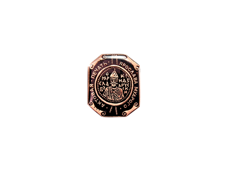 На магните изображена актовая печать Ярослава Мудрого. Погрудное изображение мужчины в остроконечном шлеме, с усами и бородой, в плаще с прямоугольным вырезом у шеи, скрепленным круглой фибулой. По сторонам колончатые надписи: «Ярослав - князь Русский». Это уникальная портретная печать Ярослава Мудрого. В древних летописях сказано, что Ярослав мудр потому, что построил храмы Святой Софии в Киеве и Новгороде, то есть посвятил главные храмы городов Софии — премудрости Божьей, которой посвящён главный храм Константинополя. Тем самым Ярослав объявляет, что русская церковь стоит наравне с церковью византийской. При Ярославе Владимировиче был составлен первый известный свод законов русского права. Ярослав Мудрый в 1030 г. создал в Новгороде первую школу, обучившую грамоте 300 детей. Впоследствии эти ученики в качестве миссионеров были разосланы по обширнейшим пространствам Новгородской земли. Печать найдена в Новгороде на Троицком раскопе. Первая четверть XI в.