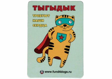 Магнитик с рисунком супер-кота "Тыгыдык требуют наши сердца" станет хорошим украшением на холодильник или рабочее место. Также может стать отличным подарком с доброй историей для родных и близких. Средства от продажи поступают в фонд "Собаки, которые любят" и будут использованы в благотворительных целях на лечение, содержание и питание бездомных животных. «Собаки, которые любят» – некоммерческая организация, которая оказывает системную поддержку животным в муниципальных и частных приютах, помогает бездомным собакам и кошкам и популяризирует гуманное отношение к животным.