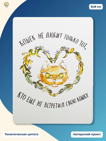 Магнит с авторским принтом отлично впишется в интерьер вашей кухни и будет радовать вас каждый день, а тематические цитаты поднимут настроение всем любителям животных. Размер магнита: 6×8 см. Данный товар представлен благотворительным фондом «РЭЙ». Фонд помогает бездомным животным и поддерживает более 40 приютов: привозит корма и лекарства, оказывает помощь в лечении животных, перевозит питомцев из приютов на первом в России бесплатном зоотакси. Также фонд проводит много мероприятий, которые посвящены дружбе животных и людей, и обучает детей и взрослых относиться к животным грамотно и ответственно. Покупая товары фонда, вы помогаете менять жизнь бездомных животных к лучшему. Вся прибыль от продаж будет перечислена напрямую в фонд «РЭЙ».