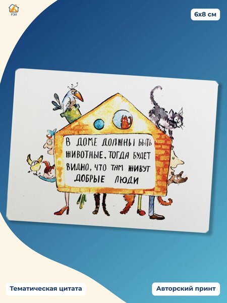 Магнит с авторским принтом отлично впишется в интерьер вашей кухни и будет радовать вас каждый день, а тематические цитаты поднимут настроение всем любителям животных. Размер магнита: 6×8 см. Данный товар представлен благотворительным фондом «РЭЙ». Фонд помогает бездомным животным и поддерживает более 40 приютов: привозит корма и лекарства, оказывает помощь в лечении животных, перевозит питомцев из приютов на первом в России бесплатном зоотакси. Также фонд проводит много мероприятий, которые посвящены дружбе животных и людей, и обучает детей и взрослых относиться к животным грамотно и ответственно. Покупая товары фонда, вы помогаете менять жизнь бездомных животных к лучшему. Вся прибыль от продаж будет перечислена напрямую в фонд «РЭЙ».