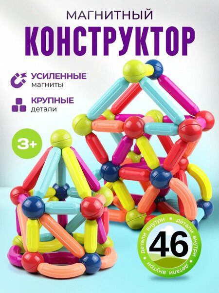 Развивает мышление — помогает ребёнку тренировать логику, воображение и творческие способности. Сильные магниты — детали прочно соединяются и не распадаются во время игры. Яркие цвета и формы — привлекают внимание и делают игру ещё интереснее. Безопасные материалы — изготовлен из прочного пластика и нетоксичных красок, безопасных для детей. Магнитный конструктор — это не просто игрушка, а увлекательное и развивающее занятие для детей. С помощью 46 ярких деталей ребёнок может создавать различные фигуры и постройки, тренируя воображение, логику и творческое мышление. Усиленные магниты обеспечивают прочное соединение деталей, поэтому конструкции не разваливаются во время игры. Игра с магнитным конструктором способствует развитию мелкой моторики, координации движений и пространственного мышления. Родители и дети могут играть вместе, проводя время с пользой и удовольствием. Подходит для детей от 3 лет. В наборе есть все необходимые элементы — отличный подарок на любой праздник!