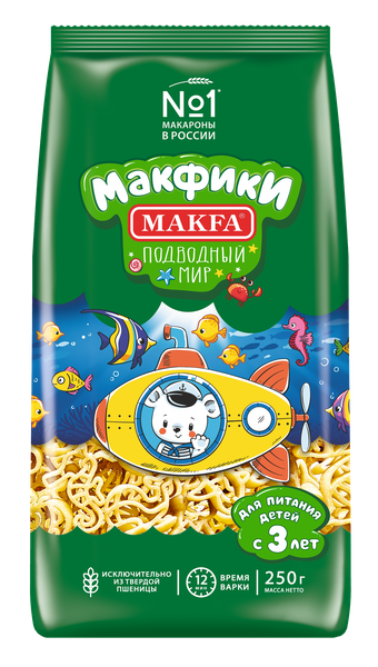 Изделия макаронные группа А высший сорт для детей старше 3-х лет. Макфики: Подводный мир. ГОСТ 31743. Фигурные макаронные изделия, изготовленные из твердой пшеницы. Изготовлены на бронзовых матрицах, благодаря шероховатой поверхности отлично удерживают соусы. Понравятся детям. Крупные узнаваемые фигурки. Рекомендации по использованию продукта: Макаронные изделия являются источником содержания белка, играющего важную роль в функционированию детского организма. Содержание в 100 граммах макаронных изделий: белок - 12 г (22% от средней рекомендуемой суточной нормы потребления для детей 3-7 лет, установленных законодательством РФ).