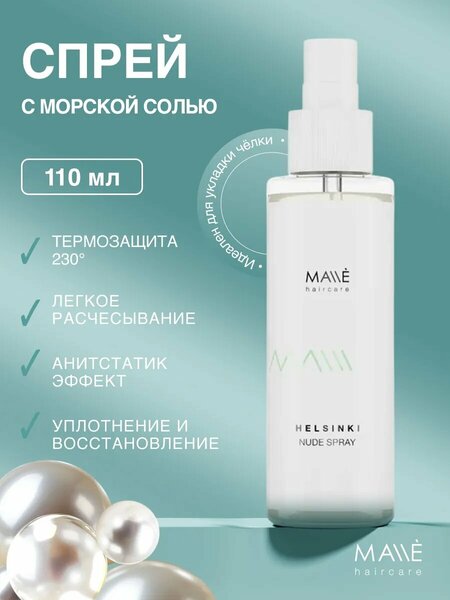 Термозащитный несмываемый спрей для волос от MALLE из линейки хельсинки с морской солью, насыщенный комплексом аминокислот и питательных компонентов, обеспечивает эластичную фиксацию, добавляет текстуру и объем волосам. Профессиональный уход за волосами в домашних условиях. Спрей хельсинки облегчает расчесывание, увлажняет и разглаживает кутикулу волос, кондиционирует, предотвращая потерю влаги, увеличивает послушность и гладкость волос. Спрей способствует восстановлению гидролипидной оболочки волосяных стержней, которая служит естественной защитой здоровых волос. Спрей - идеальное решение для восстановления и увлажнения поврежденных волос, пострадавших в результате химического воздействия или регулярных процедур сушки и укладки. Защитный спрей против секущихся кончиков, обеспечит укрепление, увлажнение и смягчение тонких поврежденных волос. Несмываемый спрей MALLE - эффективная термозащита для волос. Уменьшает пушистость, препятствует механическому повреждению волос, обеспечивает дополнительную УФ- и термозащиту. Профессиональный несмываемый спрей Мале идеально подходит для пористых волос. Ингредиенты выравнивают структуру волоса, заполняя все пробелы в структуре. Также средство защищает волосы от дальнейшего повреждения (расчесывание, сушка, заколки и резинки, укладка), воздействия окружающей среды, а также укрепляет волосы. Спрей дает блеск и сияние волосам.