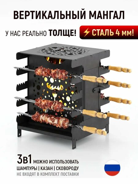 Вертикальный экомангал для приготовления полезной пищи без канцерогенов – это сразу несколько полезных приобретений в одном! Мангал. Компактный, удобный, вместительный: конструкция занимает меньше места при большем КПД. Можно приготовить больше блюд на том же количестве дров или углей. Можно начинать готовить сразу после розжига. Можно готовить различные продукты одновременно, например, курицу и свинину, расположив шампуры с разных сторон, при этом запахи не перемешаются. Экологичный: мясо не пропитывается вредными продуктами горения, образующимися в обычном мангале при попадании сока и жира на угли, а также при использовании жидкостей для розжига. Продуманный: можно менять расстояние от шампура до жаровни, а также не нужно непрерывно следить за мясом – оно не сгорит. Мангал разборный и мобильный, сборка занимает не более 2 минут! Печь для казана, сковороды, гриля. Одновременно с приготовлением шашлыка или отдельно на нашем экомангале можно приготовить плов или настоящую уху, пожарить яичницу, вскипятить чайник или запечь овощи на гриле! Уличный камин. Языки пламени, вырывающиеся из ажурных прорезей – это безумно красиво и очень романтично. Мы специально сделали из технологических отверстий приятный глазу рисунок. Летние вечера на садовых качелях перед мангалом-камином с ароматным чаем в руках. О чём ещё мечтать? В местах наибольшего нагрева (на дне и на крышке) сталь 4 мм, на стенках – 3 мм. Это сделано специально для того, чтобы со временем от неравномерного нагрева не возникало деформаций. В комплекте поставки всё, что нужно для сборки, включая ключ.