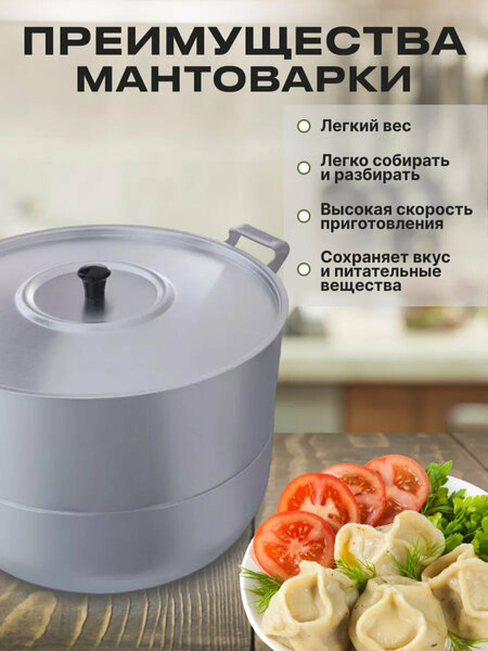 4-ярусная пароварка для манты (алюминиевая) — быстро, удобно, вкусно! Идеальное решение для приготовления на пару обезжиренных манты, пельменей, вареников, котлет, овощей и других блюд дома! 4-ярусная пароварка для манты позволяет готовить большое количество еды за один раз — идеально подходит для приема гостей и семейных ужинов. ✅ Преимущества 4 яруса — готовьте больше манты/блюд одновременно Приготовление на пару — сохраняет вкус и питательные вещества продуктов Быстрый нагрев — алюминий быстро и равномерно распределяет тепло Легкий вес — легко поднимать и чистить Легко собирать и разбирать — удобно хранить Многофункциональность — не ограничивается мантами: овощи, рыба, котлеты, пельмени и т. д. Что можно приготовить? Манты, ханум, пельмени/вареники, отбивные на пару, овощи (брокколи, картофель, морковь), рыба, диетические блюда. Краткая инструкция Налейте воду в нижнюю часть → поставьте пароварку на решетки → закройте крышку → готовьте на среднем огне. (Периодически проверяйте, чтобы вода не выкипела.) Уход После использования остудите и промойте теплой водой и мягкой губкой. Используйте более мягкие металлические губки, чтобы продлить срок службы пароварки. Полный комплект Нижняя чаша (часть для наполнения водой) 4 решетки для приготовления на пару Крышка