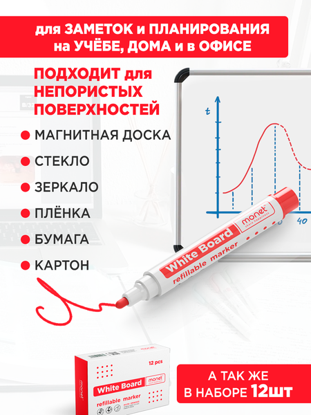 Маркер красный Monet 2MW003,1 шт для флипчартов и белых досок, стираемый, быстросохнущий