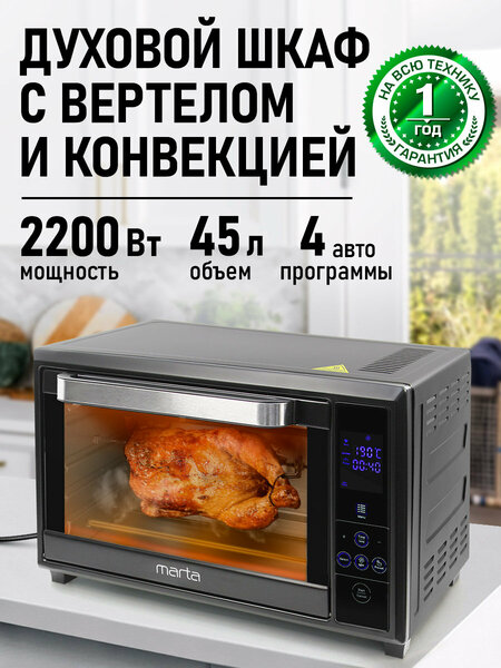 Мини-печь электрическая, 2200Вт ,45л, сенсорное упр, дисплей, подсветка, 8 авторежимов (в т. ч. конвекция, разморозка и пр.)+ручн, темп: 25-230°C, таймер 120 мин, звук. сигнал, отложен. старт, акс: вертел, эмал. противень, решетка, ручка для противня и решетки. Данная модель оснащена: • Большим цифровым дисплеем и сенсорным управлением; • 4 мощными нагревательными элементами суммарной мощностью 2200 Ватт; • Вместительной камерой с подсветкой объемом 45 литров; • 8 автоматическими программами, а также возможностью пользовательских настроек температуры и времени работы; • Режимом конвекции; верхним и нижним нагревами, работающими как по отдельности, так и вместе; • Широким набором аксессуаров: вертел, эмалированный противень, решетка, ручка для извлечения противня/решетки, ручка для вертела; • Таймером со звуковым сигналом и автоматическим выключением прибора; • Функцией отложенного старта программы приготовления. Всё это сделает процесс приготовления горячей пищи удобным и быстрым! • Вместительная камера объемом 45 литров позволит одновременно готовить несколько блюд и вмещает продукты большого размера, таких как целая тушка птицы, большой мясной рулет или пирог для всей семьи. Четыре мощных нагревательных элемента в совокупности с режимом конвекции особенно быстро прогревают камеру, поэтому электрический духовой шкаф поможет Вам приготовить самые вкусные горячие блюда, домашнюю выпечку с румяной корочкой и бесчисленное множество разнообразных кулинарных шедевров без потери времени. • Режим конвекции избавляет от необходимости перемещения блюда и противня во время приготовления, так как обеспечивает постоянную циркуляцию горячего воздуха по всей внутренней камере, за счет чего достигается одинаковая температура нагрева блюда со всех сторон, что позволяет пище запекаться и покрываться румяной корочкой равномерно по всей поверхности. Компактная мини-печь для дома, духовка для дачи, отличный подарок!