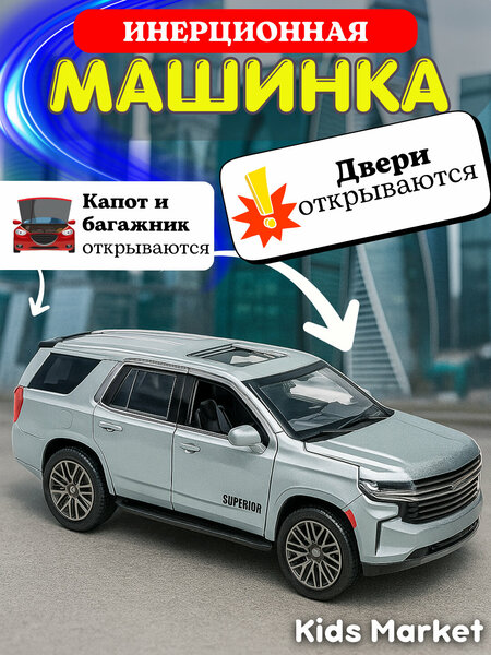 Дополнительные свойства: Машинки оснащены инерционным механизмом и едут от лёгкого толчка. Корпус выполнен из прочного металла. Все модели имеют открывающиеся двери. У машинок детализированный салон и внешний дизайн. Колёса обеспечивают плавное и устойчивое движение. Каждая модель выполнена в виде реалистичной копии настоящего автомобиля. Более подробная информация о каждой модели указана в описании ниже. Мощный и стильный внедорожник выполнен с максимальной проработкой деталей. Машинка яркая, крупная и очень реалистичная — идеальна для активной игры и коллекции. Особенности модели: Металлический корпус и крупные колёса. Инерционный механизм — разгоняется от лёгкого толчка. Открываются двери, капот и багажник. Детализированный интерьер и подкапотное пространство. Игрушка дарит массу возможностей для игры и выглядит как уменьшенная копия настоящего авто.