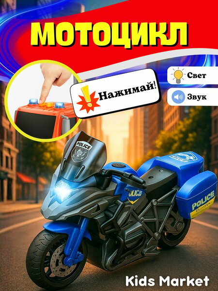 Яркий полицейский мотоцикл с эффектами света и звука. Оснащён кнопками управления — при нажатии включаются мигалки и звучат сирены, создавая реалистичную атмосферу настоящей полицейской погони. Изготовлен из прочного безопасного пластика. Подходит для игр дома и на улице. Особенности: Световые и звуковые эффекты Реалистичный дизайн Прочные колёса и корпус Удобные кнопки управления Работает от батареек
