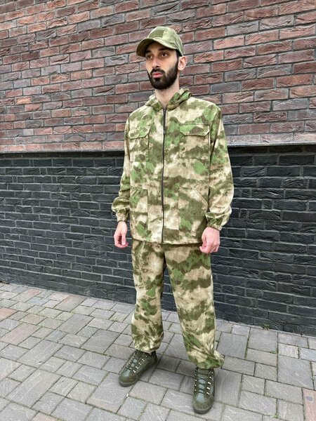 Легкость (костюм очень легкий и прочный. Даже в условиях повышенной жары в нем будет комфортно передвигаться). Свобода движений (костюмы делают максимально удобными, не стесняют движений, не натирают). • Куртка на застежке «молния» с капюшоном • Два накладных кармана на поясе куртки • Брюки с двумя прорезными карманами • Манжеты рукавов и штанин на резинке Камуфляж не сковывает прост в уходе и долговечен. Выполнен из ткани сорочка.