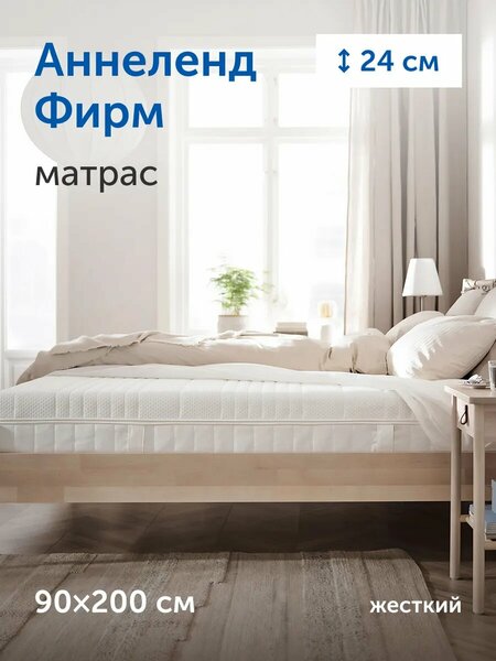 Аннеленд Фирм — матрас из ассортимента Икеа, представлен в разных размерах: на односпальную и двуспальную кровать. Высота 24 см. Изготовлен в России на производственных мощностях для проекта IKEA (Икея), официальным производителем IKEA. Шведская коллекция. Жесткий матрас, выдерживает до 140 кг на одно спальное место. Обеспечивает упругую жесткую поддержку. Высокие технологии по европейским стандартам качества. Пружинный блок карманного типа Pocket состоит из множества автономных ячеек. Идеально подстраивается под изгибы тела, равномерно распределяя нагрузку и обеспечивая точечную поддержку позвоночника (ортопедический эффект). В составе многослойной конструкции матраса сочетаются 3 вида пены: 1) высокоэластичная пена для упругой поддержкаи, 2) пена повышенной мягкости для лучшей адаптации под анатомические особенности тела, 3) пенаAirFoam. Благодаря такому сочетанию материалов матрас способствует комфортному положению во время сна. Трикотажный чехол, стеганный на синтепоне, придает матрасу эстетичный внешний вид. Мягкий наполнительно равномерно распределен внутри и зафиксирован стежкой. За матрасом легко ухаживать: с помощью молнии по всему периметру чехол можно легко снять, поделить на 2 части и постирать в машинке. Практичные ручки по бокам — матрас легко развернуть. Это особенно удобно при уборке, смене постельного белья или перестановке мебели. При производстве все материалы проверяются на безопасность и износостойкость. Готовый матрас также прошёл физико-механические испытания на долговечность, которые имитируют интенсивное использование. Доставляется в компактном скрученном виде (в рулоне). После вскрытия упаковки матрас в скрутке полностью распрямится и восстановит свою форму в соответствии с заявленным размером через 72 часа. Спать на матрасе можно сразу же после распаковки. Исключение – доставка в зимний период. На морозе некоторые компоненты состава матраса (пена и т. д.) становятся хрупкими, поэтому им нужно 24 часа, чтобы восстановить свои свойства при комнатной температуре. Оставьте матрас прогреться в теплом помещении на сутки (вдали от батарей и обогревателей), и только потом распаковывайте.