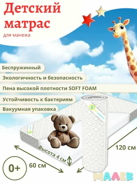 Размер: 120х60х5 см Основа матраса: Пена высокой плотности SOFT FOAM Состав слоев: • пена высокой плотности SOFT FOAM 5 см Чехол: Микрофайбер стеганый Жесткость: средняя Тип матраса: Беспружинный Цвет борта: Серый Представляем вашему вниманию комфортный и практичный матрас, идеально подходящий для игровых манежей. Этот беспружинный матрас размером 120х60х4 см обеспечит вашему малышу безопасное и удобное пространство для игр и отдыха. В основе матраса лежит пена высокой плотности SOFT FOAM толщиной 4 см. Этот материал обладает оптимальной упругостью и обеспечивает необходимую поддержку для позвоночника ребенка, способствуя правильному формированию осанки. Пена SOFT FOAM также отличается хорошей воздухопроницаемостью, что предотвращает скопление влаги и пыли внутри матраса. Чехол матраса выполнен из мягкого и приятного на ощупь микрофайбера, простеганного для дополнительного комфорта. Борт матраса выполнен в нейтральном сером цвете, который гармонично впишется в любой интерьер. Этот матрас имеет среднюю жесткость, что делает его универсальным выбором для большинства детей. Он поставляется в скрученном виде в вакуумной упаковке, что облегчает его транспортировку и хранение. Преимущества матраса: Безопасность и экологичность: Изготовлен из гипоаллергенных материалов, не содержащих вредных веществ. Легкость: Удобен в перемещении и хранении. Комфорт: Обеспечивает оптимальную поддержку и комфорт во время игр и отдыха. Долговечность: Сохраняет свои свойства на протяжении длительного времени . Срок службы 3 года. Воздухопроницаемость: Предотвращает скопление влаги и пыли. Устойчивость к бактериям: Не способствует размножению бактерий и микроорганизмов. Отсутствие запахов: Не впитывает посторонние запахи. Доступная цена: Отличное соотношение цены и качества. Этот матрас соответствует стандартам ГОСТ и имеет сертификат соответствия, что гарантирует его высокое качество и безопасность. Подарите своему ребенку комфорт и безопасность с нашим матрасом для игрового манежа!