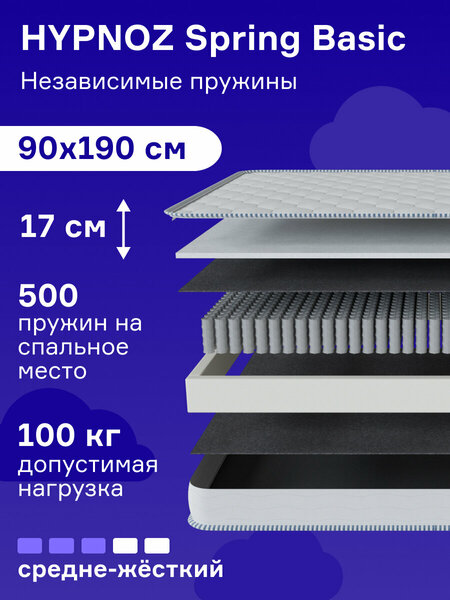 Самая доступная модель от компании HYPNOZ, которая теперь поставляется с независимым пружинным блоком! 4-ёх слойный матрас 90х190 HYPNOZ Spring Basic с независимым пружинным блоком и пеной HYPNOZ Foam. Высота матраса 17 см. Независимый пружинный блок обеспечивает средний уровень жёсткости. Оптимизация процессов производства в HYPNOZ позволила сделать матрас самым доступным на рынке среди аналогов в данном сегменте. Каждая пружина имеет индивидуальный чехол из нетканного материла для обеспечения бесшумности работы блока. Пружины обладают большой выносливостью. Матрасы с независимым пружинным блоком служат более 10 лет. Воздухопроницаемость и терморегуляция. Все слои обеспечивают проходимость воздушных потоков через матрас и поддерживают оптимальную температуру вашего тела во время сна. Специальные слои из пены с высокой плотностью HYPNOZ Foam принимают форму тела, чтобы обеспечить правильного положение позвоночника во время сна. При разработке матраса все материалы проверяются на долговечность на специальном стенде, имитирующем регулярное использование в течение 10 лет. Все материалы гипоаллергенны и нейтральны по отношению к окружающей среде. Матрас доставляется в рулоне.