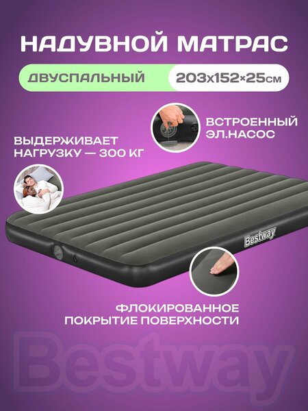 Матрас надувной Bestway Venture 6716S — это удобное и практичное решение для комфортного отдыха в любых условиях. Модель сочетает в себе прочность, устойчивость к нагрузкам и простоту эксплуатации. Благодаря встроенному насосу матрас надувной с насосом легко и быстро готов к использованию, что особенно удобно в поездках, на даче или при приеме гостей. Матрас надувной двуспальный обеспечивает достаточное пространство для полноценного сна двух человек. Поверхность изделия выполнена из приятного на ощупь флокированного покрытия, которое не позволяет простыням соскальзывать и добавляет комфорта во время отдыха. Надувной матрас для сна подойдет как для использования в помещении, так и на свежем воздухе, сохраняя форму и упругость даже при длительном применении. Для любителей активного отдыха и путешествий матрас надувной туристический станет отличным выбором. Он легко складывается в компактный размер и не занимает много места в багажнике или рюкзаке. Матрас надувной Bestway 67374 — это надежный спутник в поездках, который обеспечит качественный сон где бы вы ни находились.