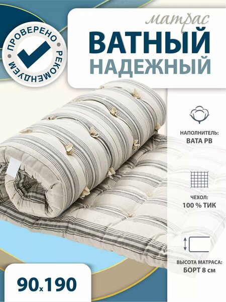 Матрас ватный, беспружинный. Размер 90х190 см, толщина 8 см. Чехол: тик. Наполнитель: вата РВ, хлопок. Этот мягкий полосатый матрас произведён в Иваново. Вата РВ (регенерированное волокно) – это натуральный материал высокого качества, которое представляет собой переработанные на специальном оборудовании остатки швейного, ватного и шерстяного производства, до состояния ваты. При доставке ватные матрасы могут иметь размеры меньше на 5-10 см по длине и ширине. Это связано с особенностями производства и транспортировки. Матрас полностью возвращает заявленные размеры максимум через трое суток использования.