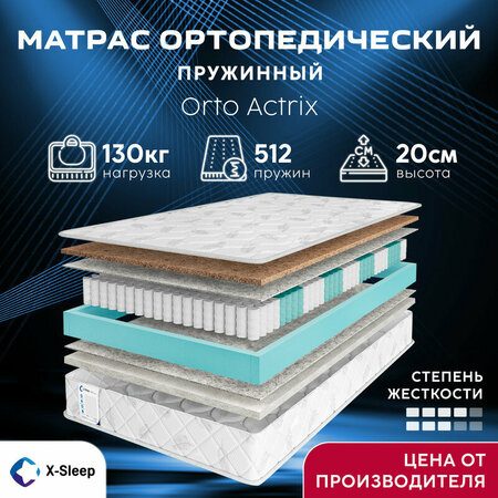 Двусторонний ортопедический матрас X-Sleep Orto Actrix сделает ваш сон действительно комфортным. Он сочетает в себе сразу два уровня жесткости – средний и жесткий, это идеально подходит для тех, кто стремится к красивой осанке, хочет крепко спать, но сомневается в выборе жесткости матраса. Попробуйте поспать на разных сторонах и выберите подходящую по своим ощущениям. Его основой служит система независимых пружин. Каждая пружина изолирована от остальных в специальном тканевом чехле. Благодаря этому пружины не скрипят, исключают эффект “волны” и “гамака”. Пружинные матрасы отлично подходят для двуспальных кроватей и пар с разницей в весе. 512 пружин на спальное место обеспечивают точечную поддержку тела и сохраняют физиологическое положение спины и суставов. Пружины изолированы специальным гипоаллергенным материалом. Термовойлок — плотный изоляционный материал, который предотвращает повреждение комфортных слоев из-за возможного трения о пружинный блок, изолирует посторонние шумы, скрипы, является дополнительным слоем для влагоотведения и терморегуляции. Сторона средней жёсткости выполнена из современного гипоаллергенного материала "Strutto", состоящего из множества волокон в виде микропружин, обладающего высоким ортопедическим эффектом. Жесткая сторона выполнена из двух сантиметров натуральной кокосовой койры. Кокос экологически чистый материал, который оказывает максимальную ортопедическую поддержку. Он придает матрасу дополнительную жесткость и поддерживает тело в анатомически правильном положении. Матрас комплектуется трикотажным чехлом с объёмной стёжкой. Прочный материал отличается мягкостью и долговечностью. Он устойчив к деформации и сохраняет прекрасный внешний вид даже спустя годы эксплуатации. Благодаря системе вакуумной упаковки на современном оборудовании, вы можете заказать матрас в рулоне в любой город. Такая упаковка не влияет на потребительские свойства матрасов, а лишь облегчает транспортировку. После вскрытия упаковки матрас полностью принимает свою форму, он готов служить и радовать вас долгие годы, обеспечивая полноценный отдых вам и вашим близким. Обращаем ваше внимание, что повторная скрутка в домашних условиях запрещена, она производится один раз и только на специальном оборудовании! В нашем ассортименте взрослые пружинные и беспружинные матрасы, детские матрасы, защитные и ортопедические наматрасники разных размеров, в том числе и нестандартных!