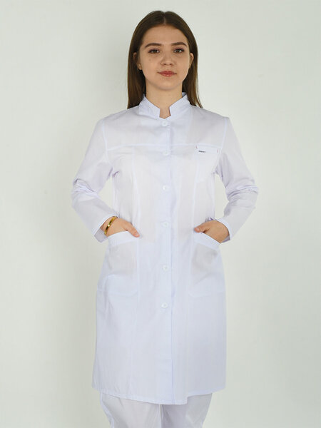 Женский медицинский халат белого цвета с длинным рукавом и со стойким воротником производства фирмы Nibax. Воротник стойка в халате создает завершенный образ. Длина халата укороченная. Минималистичный дизайн халата придает образу элегантности. Медицинский халат застегивается на пуговицы. Модель с двумя удобно расположенными и вместительными карманами и нагрудным карманом. Небольшие боковые разрезы вдоль ноги визуально вытягивают силуэт, к тому же не стесняют ваших движений. Резинка на спинке халата подчеркивает линию фигуры. Приталенный силуэт добавляет женственности. Ткань средней плотности, очень качественная, стойкая к выгоранию и истиранию, легко отстирывается, относится к категории малосминаемых. Больше наших моделей по марке Nibax в нашем магазине.