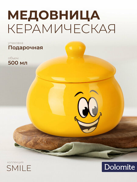 Окружите себя Улыбками! Подарите хорошее настроение себе и своим близким! Коллекция посуды "SMILE" - это забавные, яркие рожицы, заряд веселья и позитива на весь день. Восемь разных улыбок подарит ВАМ серия "SMILE". Выберите ту, которая больше всего подходит Вашему отличному настроению! Медовница "Smile", 500 мл, Dolomite Дополнительные подробности: Дизайн рисунка: смайл. Комплектация: медовница - 1 шт. Рекомендации по использованию: СВЧ - Нет. ПММ - Нет. Размер штуки: 13х13х12см. Размер товара в упаковке: 13х13х10см. Материал: керамика. Вид упаковки: индивидуальная брендированная коробка. Банка с изображением смайлика улыбка в подарочной упаковке можно использовать для: хранения сахара, специй, соли и перца, меда, сыпучих продуктов, чая, кофе. Емкость может применяться как: сахарница с улыбкой, солонка, перечница, медовница, банка для хранения. Полезный подарок на 8 марта, День рождения, новоселье и другие праздники