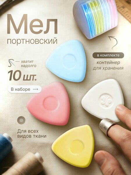 Мел портновский треугольной формы идеально подходит для работы с различными типами тканей. Четкие контрастные отметины легко наносятся и не растекаются, обеспечивая точность при раскрое. Компактный набор из 10 штук удобен для хранения и всегда готов к использованию.