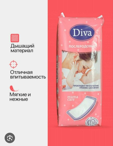 Гигиенические прокладки Diva “Mamma Care” Тип: Гигиенические прокладки (для послеродового периода) Предназначены для: Женщин в послеродовой период Функция: Надежное впитывание послеродовых выделений (лохий) и обеспечение гигиены Особенности: Высокая впитываемость Изготовлены из мягкого и приятного для кожи материала Уменьшают раздражение кожи Большой размер, обеспечивают максимальную защиту Применение: После родов, после гинекологических процедур Дизайн упаковки: С изображением матери и ребенка, розовый цвет Надписи: «Гигиенические прокладки», «Mamma Care», «Послеродовой период»