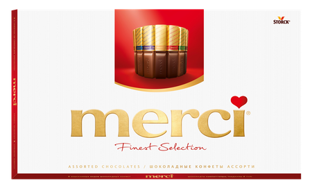 Набор шоколадных конфет merci Finest Selection – это удовольствие выбора из коллекции изысканного европейского шоколада и особый способ сказать «спасибо» дорогим и близким людям за то, что они есть в нашей жизни. merci. Спасибо что ты есть! Подарочные шоколадные конфеты merci производятся в Германии из отборных высококачественных ингредиентов и сертифицируются по международным и внутренним стандартам качества.