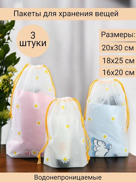 Набор водонепроницаемых мешочков/ чехлов (дорожных пакетов) для хранения вещей. В комплекте включено три Водонепроницаемых мешка разных размеров: 20х30, 18х25, 16х20. Вариантов для использования мешков огромное количество, например: 1) Органайзер для хранения вещей в чемодане для путешествий. Чехол подходит для хранения косметики, белья, средств личной гигиены, документов , обуви и т. д. 2) Мешочки для детского сада и школы для хранения сменных вещей: маек, штанишек, трусов Вашего ребенка 3) В разгар пляжного сезона Водонепроницаемый мешок для бассейна и пляжа подойдет для влажного купальника, сланцев или тапочек 4) Данные пакет подойдут для любителей похода, охоты и рыбалки. Пакеты отлично спасут Ваши личные вещи от непогоды т. к обладают влагоотталкивающими свойствами. 5) Дома в них можно хранить косметику, лекарства, бытовую химию, спецсредства, подарков. 6) Контейнер организация гермомешок, эко мешок, экомешок. Многоразовые непромокаемый , пакеты на завязках, мешочек для детско обуви в шкафу, пакет для бассейна и мокрых вещей , на замке, пакет для влажных вещей и аксессуаров.