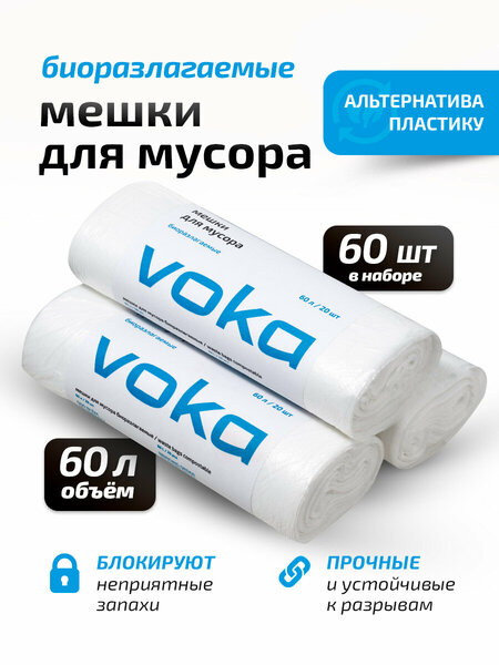 Мешки для мусора VOKA — прочное, экологичное и надёжное решение для утилизации отходов. Выполненные из биоразлагаемого материала, они полностью распадаются в природе за 3–4 года, не выделяя токсичных веществ. Подходят для использования дома, в офисе, на даче или в мастерской — устойчивы к разрывам, проколам и растяжению, не боятся жары и мороза, сохраняют прочность при экстремальных температурах. Мешки рассчитаны на ведро объёмом до 15 литров. В одном наборе — 60 штук (3 рулона по 20), каждая единица имеет размер 58×68 см и плотность 6 мкм. Перфорация позволяет легко отделять мешки, а эластичный материал подстраивается под содержимое без риска разрыва. Плотная структура блокирует неприятные запахи, предотвращает протекание и сохраняет внутреннюю чистоту мусорного ведра. Способ применения: поместите мешок в мусорное ведро, закрепив края. наполните его отходами, не превышая предельный объём и вес. При наполнении крепко завяжите мешок. Утилизируйте его в соответствии с правилами сбора отходов. Мешки не рвутся даже при нагрузке до 5 кг, подходят для бытовых, пищевых, офисных, а также лёгких строительных отходов. Удобное применение, высокая надёжность и забота об окружающей среде.