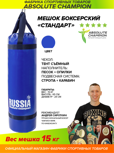 Груша для бокса изготовлена специально для Вас и заряжена успехом чемпионов Мира! Мешок для бокса разработан при участии профессионального боксера и чемпиона Мира Андрея Сироткина и изготовлена фабрикой спорт товаров Absolute Champion! Груша для бокса имеет отличную форму и изготовлена из прочного тента плотностью 650 г/м2. Груша состоит из чехла, наполнителя и системы крепления. Наша груша прослужит Вам долго, вы можете быть уверены в качестве продукции на 100% Наполнитель песок и опилки. Подвесная система мешка состоит из стропы и карабина. Внутри между чехлом и наполнителем проложен изофлекс, что улучшает качество и внешний вид груши. Каждая груша надежна упакована в пакет и плотный картон, что защищает ее при транспортировке. Рекомендуется наносить удары в защитной экипировке (защите). В нашем ассортименте представлена широкая линейка различных боксерских мешков, как для детей и подростков, так и для взрослых. Есть груши с цепями, так же представлена широкая цветовая гамма и различные веса 15, 22, 20, 25, 30, 35, 40, 60, 50, 65 кг. Качество соответствует мировым стандартам. Песок (без резиновой крошки ппу) У нас Вы можете приобрести спортивные товары и различный инвентарь: кронштейны для мешков, турники настенные, турник 3 в 1, турник брусья 3в1, шведские стенки, турник наддверный (крепежи), хайлетсы, эспандеры, детские тарзанки и качели для детей, мягкие ледянки, ролик для пресса, товары для детей и многое другое. Переходите на наш магазин Absolute Champion и выбирайте товары для себя и в подарок (подарочные наборы на день рожденье) для мамы (женские), мужа, бабушки, мальчика, девочки или папы. Для Вас проводим различные акции. На всю нашу продукцию гарантия от надежного российского производителя с 25 летним опытом работы 1 год. Отличный подарок для каждого, на любой праздник и на Новый год, это практично и такой подарок будет всегда полезен для здоровья, не ждите повода, сделайте подарок себе и своим близким уже сегодня и к 23 февраля и 8 марта! Покупайте продукцию от фабрики спорт товаров Absolute Champion и получайте товары, заряженные энергией успеха Чемпионов Мира!