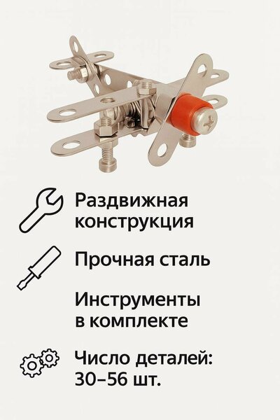 Металлический конструктор CREATIVE METAL — развивающий STEM-набор для детей Описание: Металлический конструктор CREATIVE METAL — это увлекательный и развивающий набор, который помогает детям развивать логику, мелкую моторику, усидчивость и инженерное мышление. В каждом наборе от 30 до 56 металлических деталей (в зависимости от модели) и инструменты для сборки. С набором ребёнок сможет своими руками собрать прочную металлическую игрушку с подвижными и вращающимися элементами. Это приносит настоящее чувство достижения и помогает формировать навыки моделирования. Особенности конструктора: • Детали выполнены из прочного металла • Подходит детям от 6 лет • В комплекте есть гаечный ключ и шестигранник • На коробке размещена подробная схема сборки • Вращающиеся элементы делают игру более интересной • Развивает логику, внимание, моторику и пространственное мышление Совет по выбору модели: Цвет деталей на картинке может отличаться — при выборе ориентируйтесь на фото собранной модели. Как играть? Ребёнок собирает металлическую модель, используя инструменты из набора. Сборка проста благодаря инструкции — ребёнок может повторять схему и постепенно видеть, как у него получается настоящая металлическая конструкция. Польза для развития: • тренирует мелкую моторику • учит внимательности и терпению • развивает пространственное и логическое мышление • помогает освоить основы конструирования и механики.
