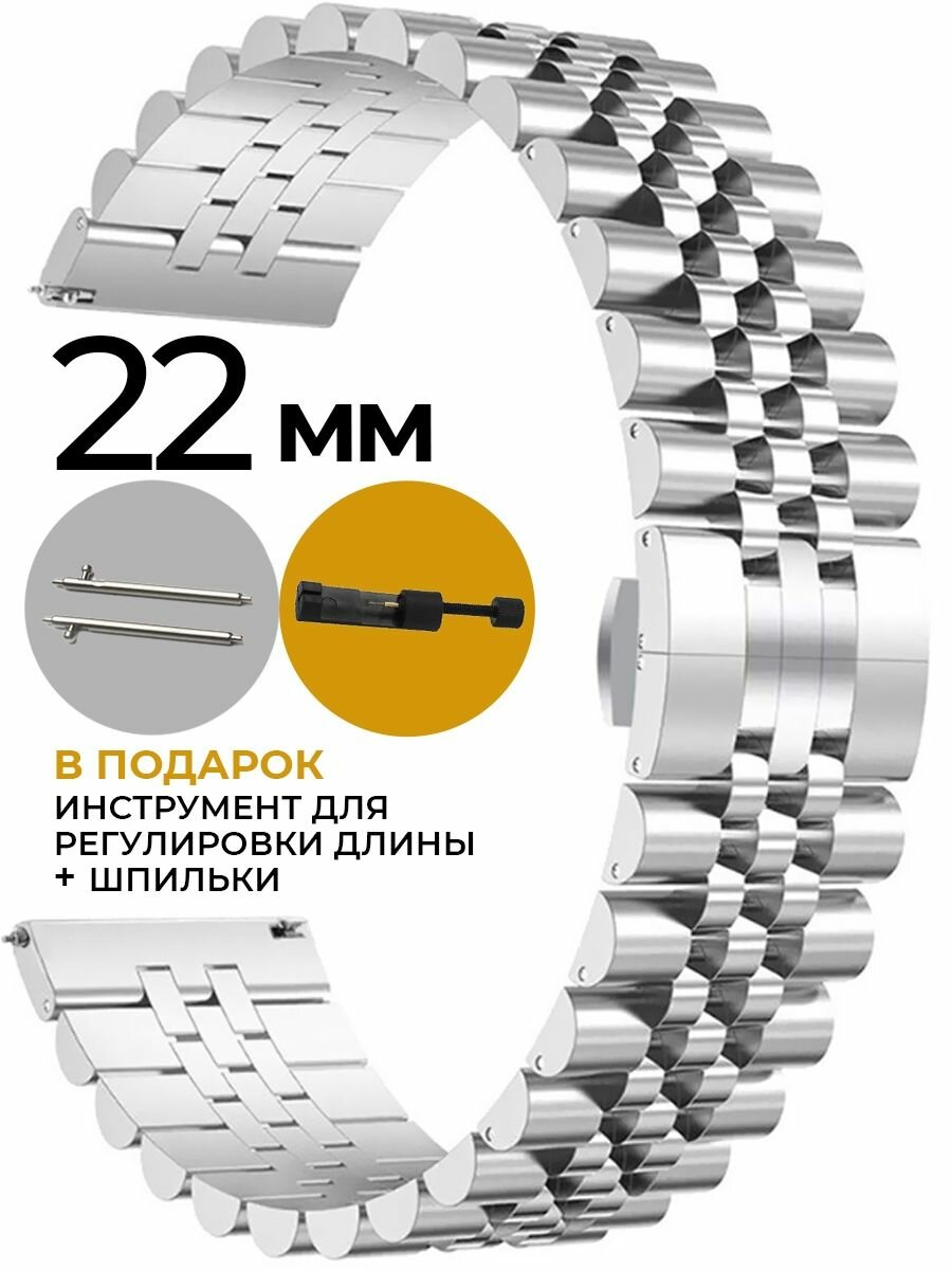 Элегантный металлический ремешок для часов 22 мм из нержавеющей стали с оригинальным плетением из цельнометаллических звеньев, выполненных в форме шестиугольников. Гладкая поверхность и стильный дизайн делают этот аксессуар отличным дополнением к вашему образу. Ремешок подходит для традиционных и для умных смарт вотч часов с шириной крепления к корпусу 22 мм. Раскладная застежка клипса-бабочка с боковыми фиксаторами обеспечивает надежное крепление и удобство использования. Укорачивание браслета производится путем снятия звеньев, которые обозначены стрелками, - по 4 штуки с каждой стороны. Штифты удаляются только в одну сторону (смотри фото). Вес аксессуара составляет 75 грамм, толщина - 3,6 мм, длина в закрытом состоянии - 180 мм. Каждый браслет упакован в индивидуальную коробку и комплектуется инструментом для укорачивания и двумя металлическими быстросъемными шпильками для крепления к корпусу. Аксессуар усилит любой Ваш образ и будет отлично смотреться в сочетании как с деловым костюмом, так и с повседневной, модной или спортивной одеждой.