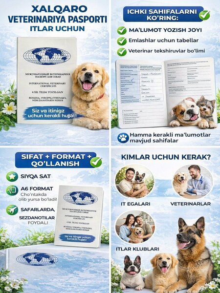 {"widgets":{"@card/UniversalPromoBadge":{"/content/page/fancyPage/defaultPage/universalPromoBadge":{"wrapperProps":{"margins":{"bottom":"3"}},"initialTime":1771149373545,"offerComposeId":"1329011898161580695"}}},"meta":{"/content/page/fancyPage/defaultPage/universalPromoBadge":{"name":"@card/UniversalPromoBadge"}},"collections":{"productServiceSnippets":{"1329011898161580695":{"productSnippet":{"snippetId":"document_id","type":"MODEL_CARD_LAYOUT","productPayload":{"snippetStyle":"NORMAL","title":{"value":"Международный ветеринарный паспорт для собак"},"badges":{},"price":{"actualPrice":{"amount":{"intPart":25000,"currency":"UZS"},"style":"RED","type":"OTHER_DISCOUNT"},"oldPrice":{"amount":{"intPart":49000,"currency":"UZS"},"style":"STRIKETHROWED"}},"gallery":{"mediaItems":[{"picture":{"baseUrl":"https://avatars.mds.yandex.net/get-mpic/16910857/2a0000019c1f2a3a7bd6598c8fb4e68a23a0/","width":960,"height":1280,"title":"Международный ветеринарный паспорт для собак"},"type":"IMAGE"},{"picture":{"baseUrl":"https://avatars.mds.yandex.net/get-mpic/11393590/2a00000197f3c93c8a766fdd0df70e76467e/","width":960,"height":1280,"title":"Международный ветеринарный паспорт для собак"},"type":"IMAGE"},{"picture":{"baseUrl":"https://avatars.mds.yandex.net/get-mpic/13526260/2a00000197f3c93c87bf20238c89c386749e/","width":960,"height":1280,"title":"Международный ветеринарный паспорт для собак"},"type":"IMAGE"},{"picture":{"baseUrl":"https://avatars.mds.yandex.net/get-mpic/12420731/2a00000197f3c93c87fdad4f774ac9e8e528/","width":960,"height":1280,"title":"Международный ветеринарный паспорт для собак"},"type":"IMAGE"}]},"wishlistButton":{"businessId":198802419,"mskuId":4502175366,"modelId":1265663908,"oskuId":4502175366,"offerId":"NYKgAU-5NjYN2YEPUPJv3Q"}},"baobabPayload":{"type":"offer","wareId":"NYKgAU-5NjYN2YEPUPJv3Q","modelId":1265663908,"marketSku":"4502175366","snippet_type":"product","isExpress":false,"price":49000,"additionalPrices":[{"priceType":"withDiscount","priceValue":25000},{"priceType":"unknown","priceValue":49000}],"hid":60660562,"shopId":431782,"shopSku":"MRKT-L57KKCV9","supplierId":216616967,"supplierType":3,"isUltima":false,"oskuId":4502175366,"snippetTheme":"GRID_FULL","stockCount":5,"promoLogJoinId":"d6968c9665f07d243aeb2e381b2f7863/a2b5a783bd6d8cd9"},"themeType":"GRID_FULL"}}}}}