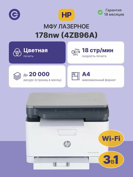МФУ лазерное HP Color Laser 178nw (4ZB96A), официальная гарантия