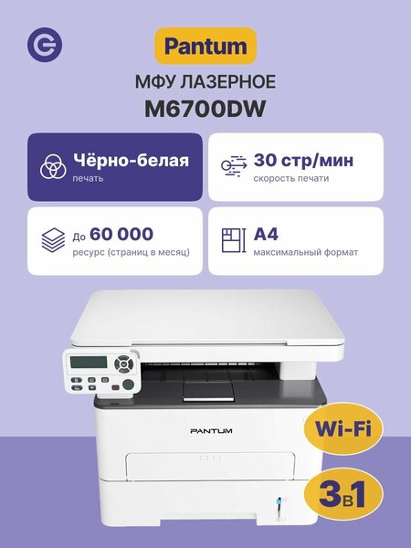 МФУ M6700DW: Многофункциональное устройство для монохромной печати и сканирования Представляем вам идеального помощника в офисе и дома – МФУ M6700DW. Это многофункциональное устройство, обладающее всеми необходимыми характеристиками для эффективной работы. Сверхбыстрая печать и качественное сканирование: Скорость печати этого МФУ впечатляет: 30 стр./мин. для формата A4 по ISO/IEC 24734, что гарантирует эффективное решение вашей печатной задачи. Выход первой страницы занимает менее 7.8 секунды. А разрешение печати до 1200x1200 dpi обеспечивает четкость и высокое качество вывода. Высокая производительность и экономия ресурсов: M6700DW спроектирован с учетом вашей продуктивности. Его месячный объем печати составляет впечатляющие 60 000 страниц, а автоматическая двусторонняя печать помогает сэкономить бумагу. Интуитивно понятное управление: Пользовательский опыт упрощен благодаря передней панели с ЖК-дисплеем. Вы сможете легко настраивать устройство в одно касание. Современные технологии: M6700DW оснащен Wi-Fi и NFC, что делает процесс печати более удобным и свободным от проводов. Вы также можете сканировать документы непосредственно на ПК, по электронной почте, FTP, а также на мобильные устройства под управлением iOS или Android.